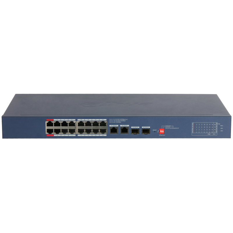 | Ethernet портове | 16 × RJ-45 10/100/1000 Mbps (PoE); 2 × RJ-45 10/100/1000 Mbps (Uplink); 2 × SFP 1000 Mbps (Uplink) |