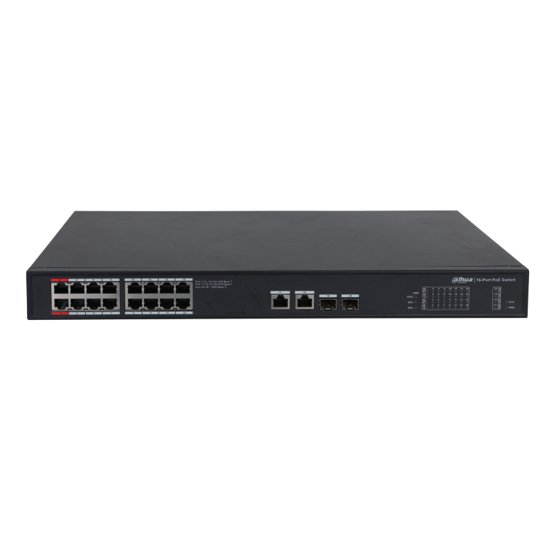 Ethernet портове16 × RJ45 10/100/1000 M (PoE), 2 × RJ-45 10 M/100 M/1000 M (uplink), 2 × SFP 1000 M (uplink)